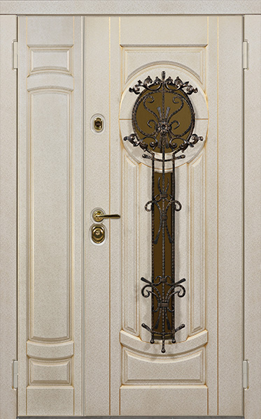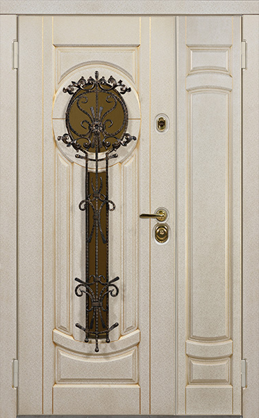 Двухстворчатая парадная дверь с ковкой и стеклом белая №30 — это сочетание красоты и надёжности. Конструкция из профильной трубы 50х25 мм и металлического листа толщиной 2 мм обеспечивает долговечность и стойкость к внешним воздействиям. Элементы ковки придают двери изысканный вид, а стеклопакет позволяет создать атмосферу лёгкости и прозрачности. Внешняя и внутренняя отделка выполнены из плиты МДФ, что делает дверь не только привлекательной, но и устойчивой к механическим повреждениям. Для дополнительной герметичности используются уплотнители с двумя контурами, а блокираторы обеспечат безопасность. Вариативность размеров и возможность добавления дополнительных опций, таких как шумо- и теплоизоляция, делают эту модель универсальной для установки в любом интерьере. Двухстворчатая парадная дверь с ковкой и стеклом белая №30 от производителя: быстрое изготовление и монтаж в Октябрьском, индивидуальные размеры, широкий выбор материалов и фурнитуры, официальная гарантия до 10 лет.